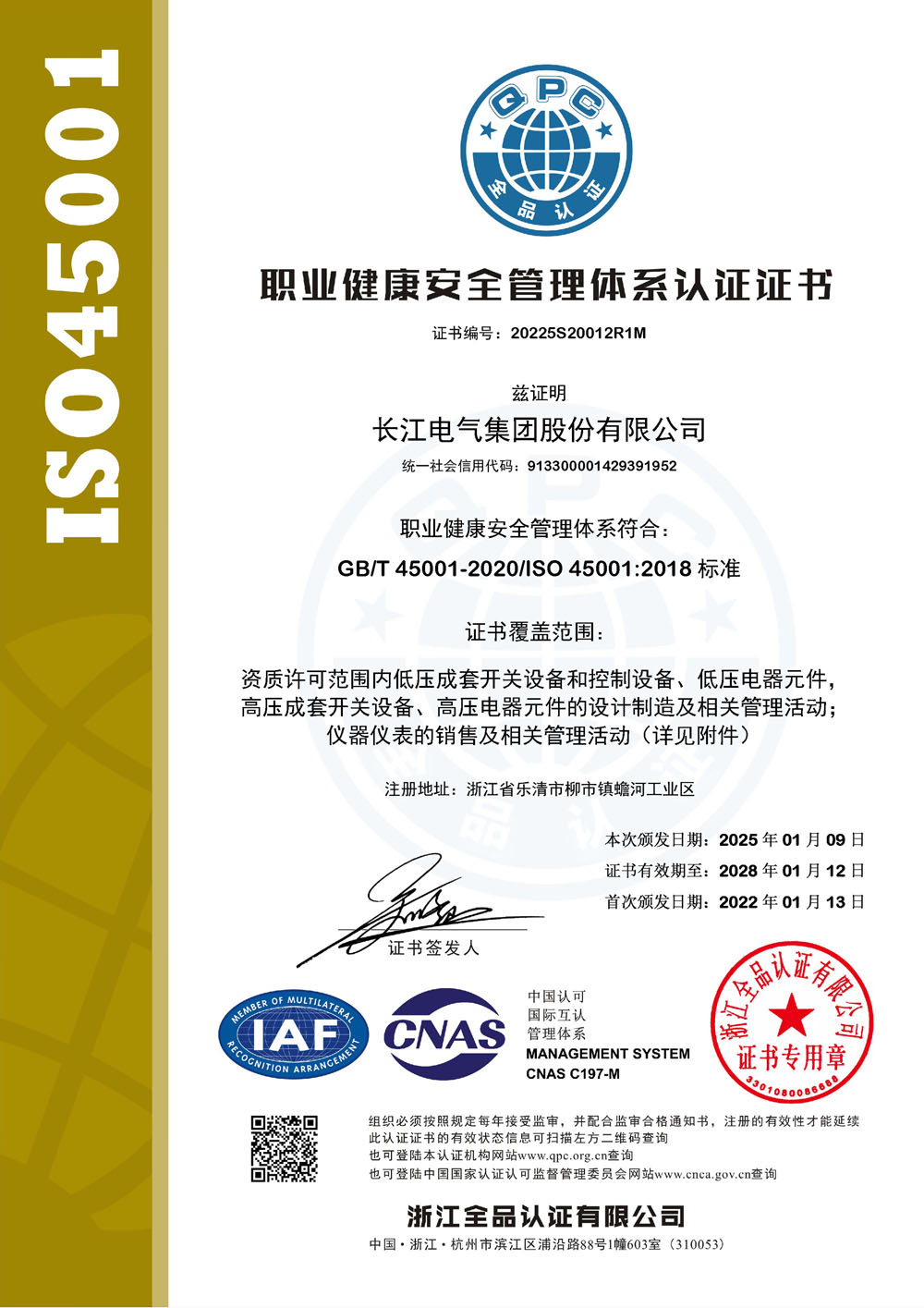 职业健康安全管理体系认证证书